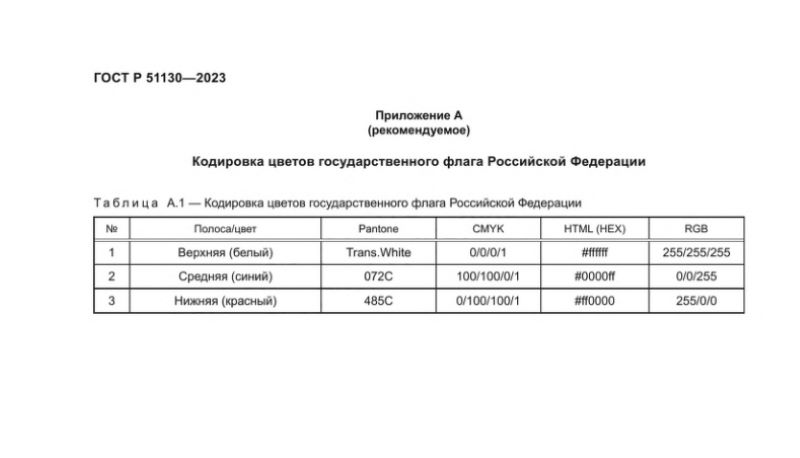 Стоит отметить, что новый стандарт содержит в редакции Приложение А «Кодировка цветов Государственного флага Российской Федерации», с номерами оттенков цветов в широко распространенных стандартизированных и цифровых палитрах, допускаемых при изготовлении флага. Это существенно облегчит работу дизайнеров при изготовлении полиграфической и иной продукции.