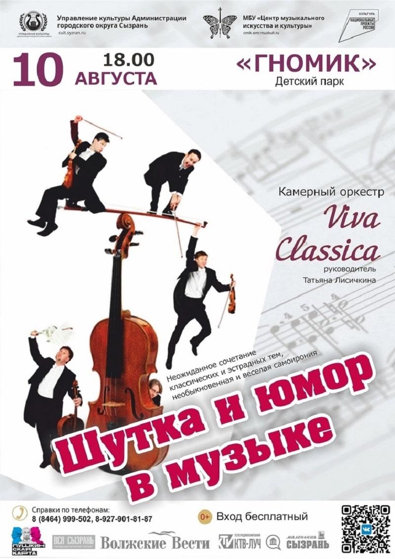 Настоящее удовольствие можно получить от классической музыки. Миф о том, что классика скучная и сложная для восприятия, в субботу 10 августа развенчает муниципальный камерный оркестр «Viva Classica». Под управлением Татьяны Лисичкиной струнный коллектив исполнит произведения композиторов-классиков и современных авторов. Для слушателей музыканты подготовили действительно нескучную программу - «Весёлый хоровод» К. Глюка, польку «Трик-трак» И. Штрауса, «Вальсирующего кота» Л. Андерсон и другие интересные пьесы.