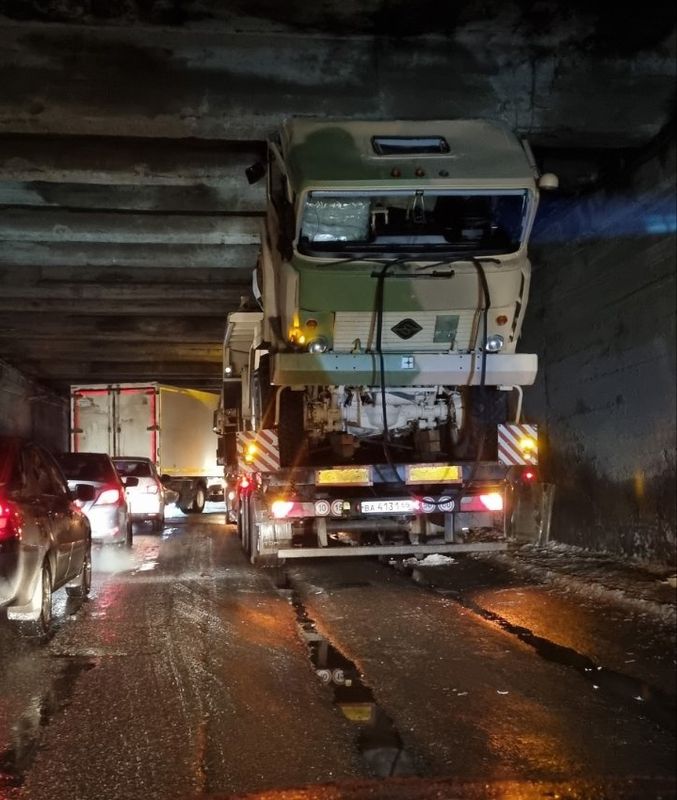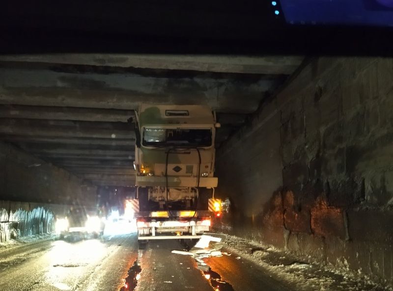 Под мостами между улицами Студенческая и Декабристов наблюдается затор из-за застрявшего грузовика. Большегруз вез в кузове еще один грузовик, и последний задел кабиной нижний край моста. От удара у второго грузовика выбило лобовое стекло. В этой довольно неординарной ситуации придется разбираться, а пока машина стоит под мостами, что в утренний час пик создало для остальных участников движения большие проблемы - растет пробка в сторону улицы Декабристов. Пострадавших по всей вероятности нет.