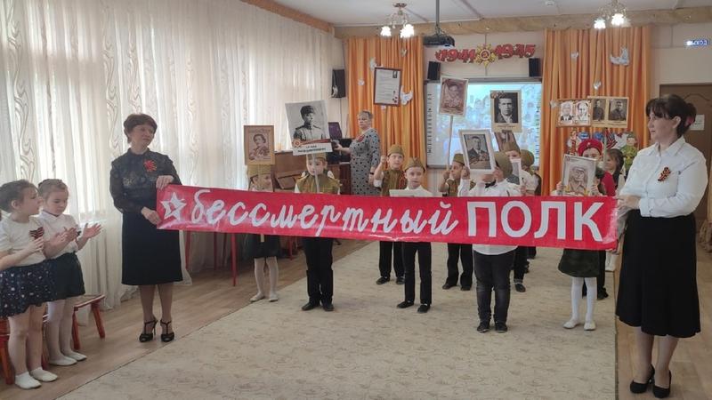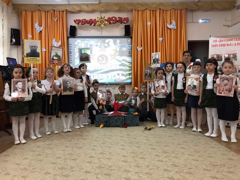 В Сызрани дети и взрослые организовали свой Бессмертный полк. В школах и детсадах Сызрани, домах культуры проходят предпраздничные мероприятия: где-то - встречи с ветеранами боевых действий, где-то - праздничные концерты, где-то - посадка аллеи в память о Победе; акция «Бессмертный полк» прошла в ряде школ и детских садов Сызрани. Свой Бессмертный полк прошел и в детском саду №62 (ГБОУ СОШ №4, руководитель СП - Татьяна Куликова, методист Татьяна Бадеева). Педагоги вместе с ребятами подготовили праздничный концерт. Программа получилась настолько трогательной, что главные гости мероприятия - родные воспитанников - не могли сдержать слез. Да и сами дети были взволнованы: кто-то из них впервые задумался о том, что война - это не только победа и звонкие марши, но и боль потерь, страх, лишения.