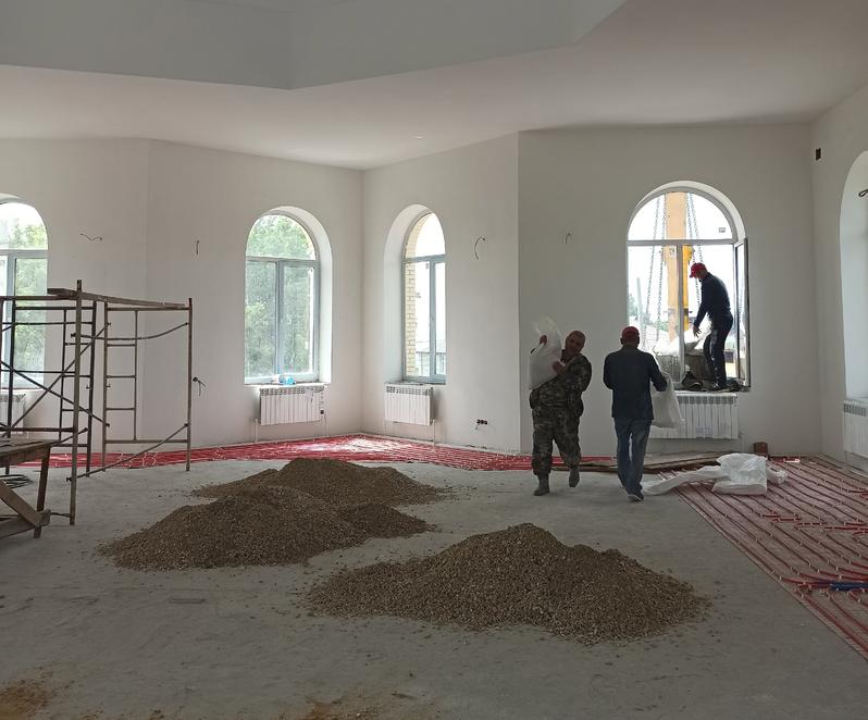 Илгизар-хазрат Сагдеев, прихожане активно жертвовали деньги на заливку полов на трех уровнях здания: «Щедрость - самый короткий путь в рай», - отметил мулла. Из необходимых 300 тысяч рублей собрано уже 247 тысяч. Полы цокольного этажа уже залиты; работы на первом этаже выполнены примерно на 45%. Для главного, молельного зала подготовлены материалы. Одновременно с заливкой полов идет монтаж забора вокруг мечети красивого бирюзового цвета. «Мы выбрали оттенок, как в знаменитом Кул-Шарифе, - поделился Илгизар Ягфарович. - Цвет объединяет голубое небо и зеленый цвет, близкий мусульманам».