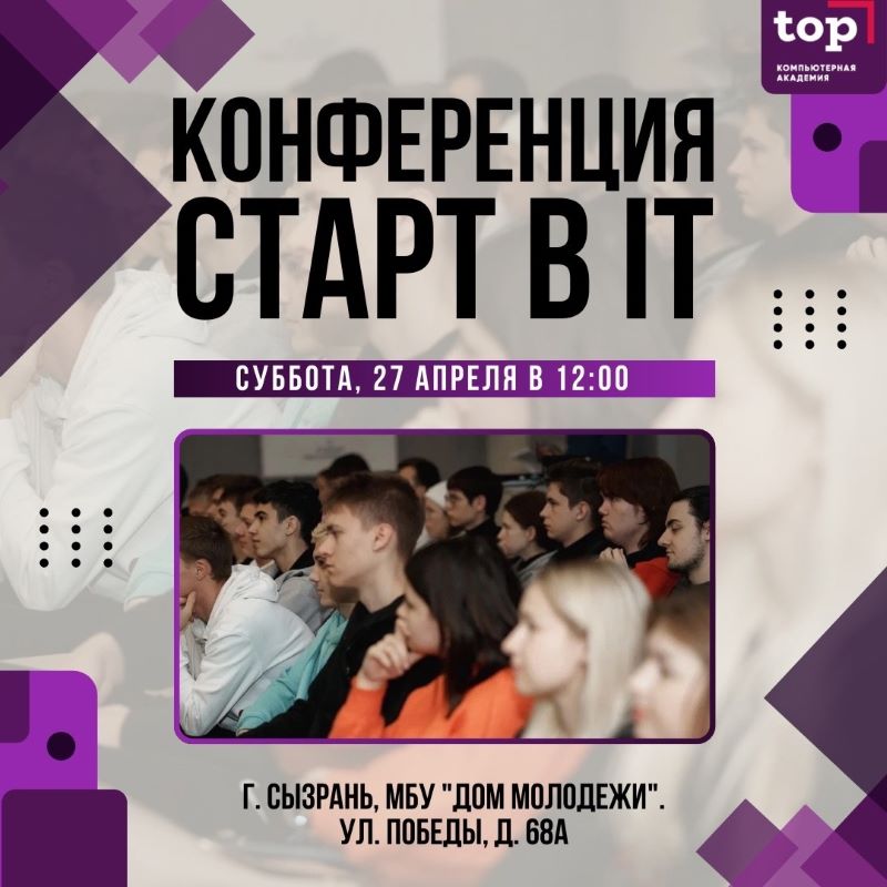 Российская конференция «СТАРТ в IT» – это крупное событие для всех, кто хочет учиться и работать в IT-отрасли. 27 апреля Сызрань станет одним из 70 городов, принимающих форум. Мероприятие проводит Компьютерная Академия ТОП. Партнёром и площадкой проведения конференции станет городской «Дом молодежи» (г. Сызрань, ул. Победы 68а). Ожидается, что мероприятие посетит более 200 молодых людей, которым интересна отрасль IT, а кто-то собирается связать с ней свое будущее. В течение четырех часов, начиная с 12.00, с участниками конференции будут общаться ведущие лидеры рынка IT сферы, приглашенные спикеры, практикующих IT специалисты. Здесь же состоятся профориентационные мастер-классы. Регистрация и участие в конференции бесплатное. Зарегистрироваться