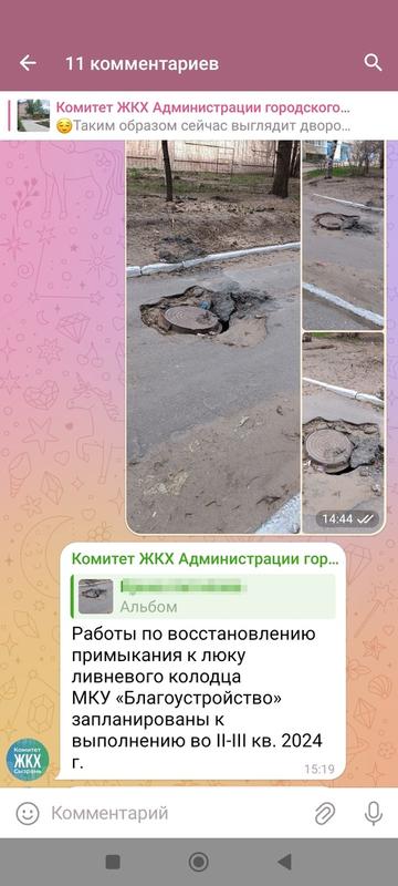 Сегодня Ирина обратилась в комитет ЖКХ и получила более-менее обнадеживающий ответ: «Работы по восстановлению примыкания к люку ливневого колодца МКУ «Благоустройство» запланированы к выполнению в II - III кварталах 2024 года».