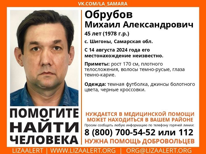 В Шигонах пропал 45-летний мужчина. Обрубов Михаил Александрович вышел из дома 14 августа, и с тех пор о нем ничего не известно. К поиску приступили спасатели ПСО «Лиза Алерт» - они дали ориентировку. Указывается, что пропавший мужчина нуждается в медицинской помощи и может быть дезориентирован.