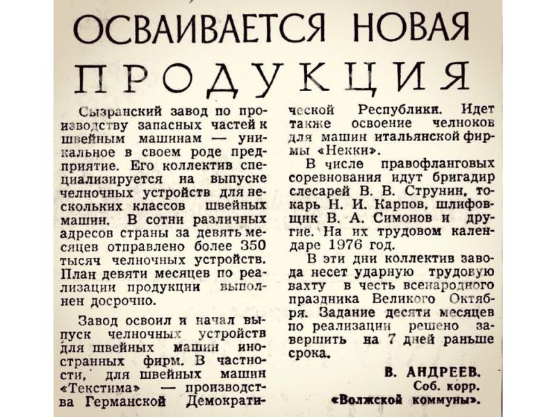 Возможно, взгляды кого-то из прохожих «цепляет» забор, огораживающий развалины корпусов на улице Карла Маркса, 20. А здесь, еще четверть века назад, находилось предприятие, о котором мало кто сейчас вспомнит и которое было утрачено нашим городом в конце 90-х гг XX века - начале 2000 гг, как и десятки других. В Сызрани производили запчасти к швейным машинкам, а на Карла Маркса, 20 числился юридический адрес предприятия. Завод по производству запасных частей к швейным машинкам сначала был сызранской артелью Искра. Он был создан в военном 1941 году и просуществовал так до 1956 года. А затем, 1 октября 1956 года, стал полноценным заводом запасных частей к швейным машинам Сызранского многопромсоюза. 60 лет назад сызранский завод освоил новую продукцию на экспорт и стал производить запчасти к машинкам для иностранных фирм.