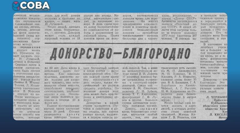Четырнадцать человек в Самарской области спасли молодую женщину, которой грозила смерть. Это произошло довольно давно, в 1973 году. Пациентку Лучкову доставили в самарскую клинику имени Семашко в почти безнадежном состоянии. Врачи понимали, насколько близка катастрофа, и решили попробовать срочное переливание крови. На помощь пациентке пришли работники местных заводов. После многократного вливания крови в болезни произошел перелом. «Я просто не могу всех перечислить поименно, но огромное материнское спасибо тем четырнадцати, которые стали для моей дочери сестрами и братьями по крови», - написала в газету «Волжская коммуна» мать спасенной пациентки.