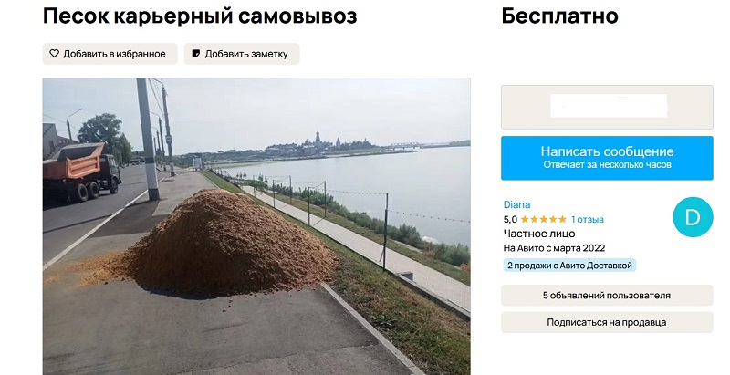 Появившееся вечером в среду, 30 августа, объявление о бесплатной раздаче карьерного песка, слегка озадачило пользователей сети, так как прикольных сообщений рекламного характера на страницах интернет-сервиса «Авито» более, чем достаточно. То уникальную чипсинку там продают за сумасшедшие деньги, то редкую банкноту за миллионы, номинал которой 100 рублей, а ходовая стоимость у коллекционеров - 300 рублей. Так что, к объявлению по самовывозу карьерного песка на Монастырской набережной многие пользователи «Авито» отнеслись скептически.