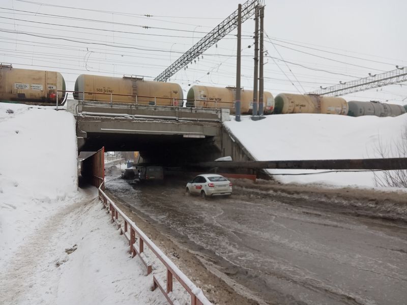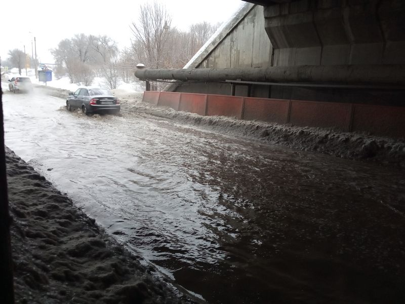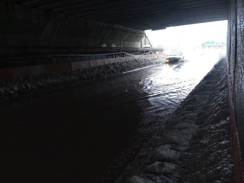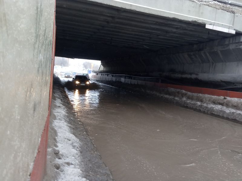 Под мостом у грузового автопредприятия потоп, дорожники с утра откачивают воду