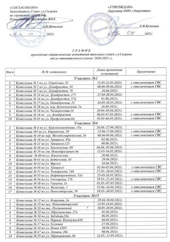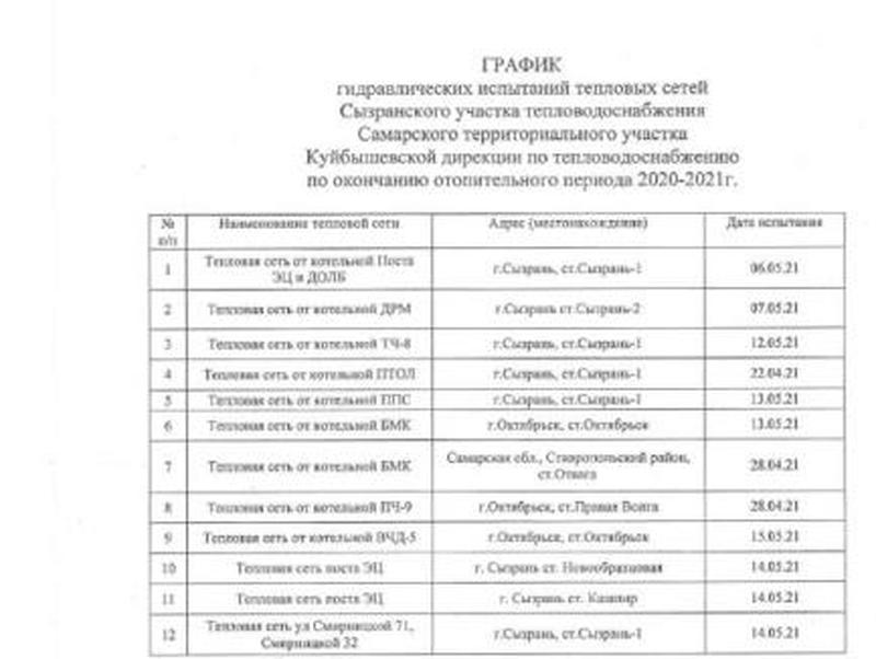 В Сызрани проходят гидравлические испытания тепловых сетей после завершения отопительного периода 2020-2021 годов. Судя по опубликованному комитетом ЖКХ графику проведения испытаний, они стартовали в нескольких котельных в конце апреля, в частности, в переулке Безенчукский, улицы Декабристов и Гоголя. Как сообщили в коммунальной службе, подача горячей воды в период проведения гидравлических испытаний прекращается. Опубликован график отключений с указанием адресов сызранских котельных. «Просим жителей с пониманием отнестись к плановым работам и временному отсутствию горячего водоснабжения», - обратились к сызранцам в комитете ЖКХ.