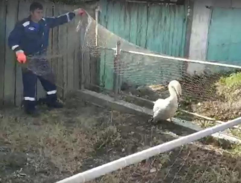 В палисаднике в Сызрани в сети попался лебедь: видео операции спасения