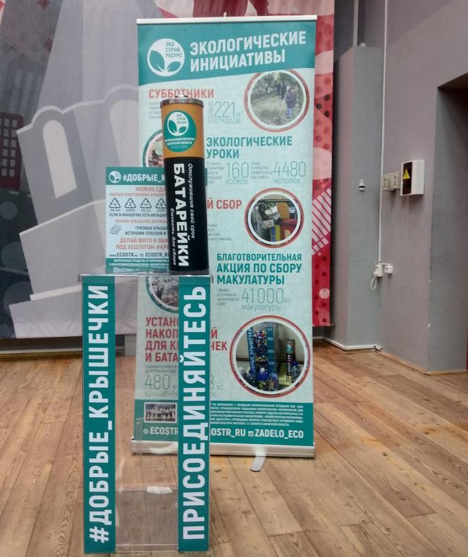 фирменными контейнерами для сбора батареек и крышек. Контейнеры красочно