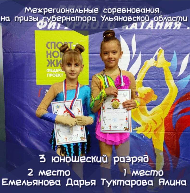 23 мая юные сызранские фигуристы приняли участие в Межрегиональных соревнованиях по фигурному катанию на коньках на призы губернатора Ульяновской области. Всего на лед вышло более 150 юных спортсменов из Ульяновска, Сызрани, а также Самары, Казани и Пензы. Сызранцы достойно выступили на соревнованиях. 1 место досталось Софии Сорокиной, 1 юношеский разряд, и Алине Туктаровой, 3 юношеский разряд. 2 место завоевали Аделина Бахтиярова, 1 юношеский разряд, Емельянова Дарья и Заживихина Анастасия – 3 юношеские разряды, Таршицейская Мария – 2 сп. разряд, Зинченко Эмилия – 2 спортивный разряд. И на 3 месте - сызранки Валерия Ильменейкина и Першенкова Евгения, 2 юношеский разряд, Куракина Ира – 1 юношеский разряд, Суханова Софья – 3 спортивный разряд.