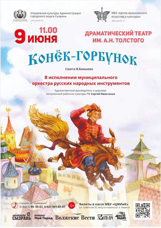 Сказка с оркестром: так назвали свой проект авторы действа, которое пройдет в сызранском драмтеатре 9 июня. Что это: концерт, трансляция мультфильма, чтение, спектакль? - вероятно, все вместе, смешение жанров, интересное как маленьким зрителям, так и взрослым. Вниманию зрителей будет представлено художественное прочтение сказки Петра Ершова «Конек-горбунок» в сопровождении муниципального оркестра русских народных инструментов, которым руководит заслуженный работник культуры РФ Сергей Иванченко. Музыкальное исполнение сюиты Владимира Бояшова будут сопровождать слайды знаменитого мультфильма.