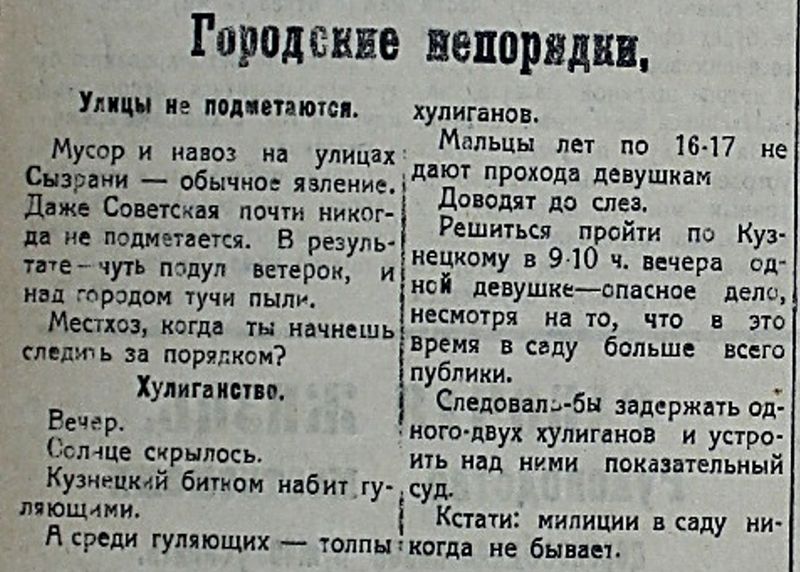 В газете «Красный Октябрь» от 15 июня 1926 года, а это почти сто лет назад была опубликована заметка: «Городские непорядки». Скрин публикации совсем недавно выложили в сообществе «Старая Сызрань». Подписчики паблика сразу обратили внимание, что уже 100 лет назад город испытывал те же проблемы, что и сейчас. Она стоит того, чтобы привести ее целиком. Итак, в тот день «Красный Октябрь» сообщал, что в городе улицы не подметаются. «Мусор и навоз на улицах – обычное явление. Даже Советская почти никогда не подметается. В результате – чуть подул ветерок, и над городом тучи пыли. Местхоз, когда ты начнешь следить за порядком?». Не кажется, что тот же вопрос горожане задают до сих пор – то администрации, то коммунальным службам?