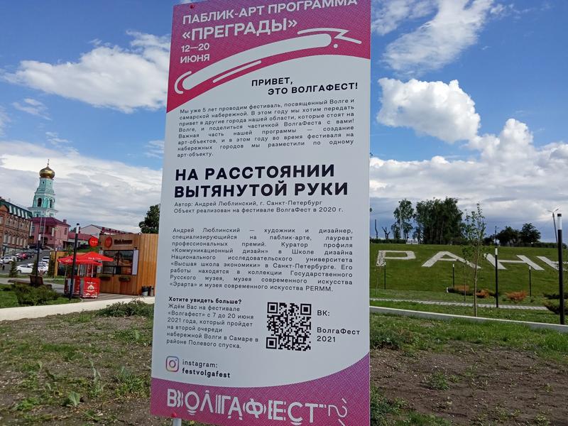 На сызранской набережной сегодня появился новый арт-объект. В понедельник, 7 июня, в Самаре стартовал международный фестиваль «ВолгаФест – 2021». В рамках фестиваля на общественных пространствах Самары, Сызрани, а также Тольятти, Жигулевска, Октябрьска и Приволжья появились паблик-арт объекты. Сызранскую набережную до 20 июня украсит арт-объект «На расстоянии вытянутой руки». Автор работы – художник и дизайнер, специализирующийся на паблик-арте, лауреат профессиональных премий Андрей Люблинский (г. Санкт-Петербург). Работы художника находятся в коллекции Государственного Русского музея, музея современного искусства «Эрарта» и музея современного искусства PERMM.