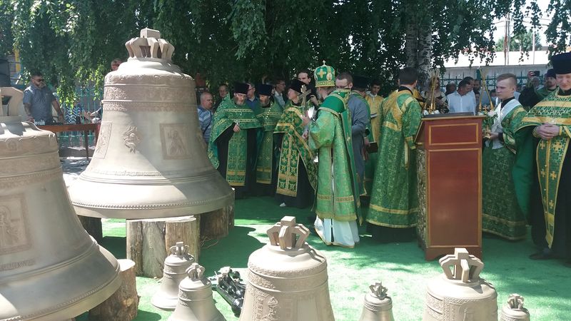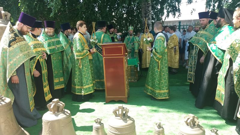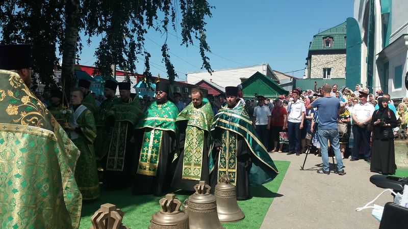 Вчера, 20 июня, в день святой Троицы – праздника, который считают днем рождения Церкви, в Казанском кафедральном соборе Сызрани произошло важное событие - освящение и поднятие на звонницу новых колоколов храма. Это событие - равное которому происходит раз в десятилетия. Не стоит удивляться, что к нему был прикован интерес многих горожан. За полчаса до особого молебна на территории храма собрались десятки православных верующих в ожидании важного момента – в числе первых услышать звук новых колоколов. После литургии в храме владыка Леонтий – епископ сызранский и шигонский, провел молебен у самих колоколов. К службе присоединились священнослужители Сызранской епархии, облаченные в праздничные, зеленые, одежды.