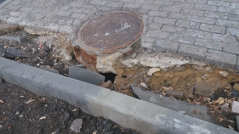 Как считает мужчина, дальше разбирать плитку рабочие не стали, и заложили образовавшийся небольшой провал строительным мусором - обломками бордюров и кирпичей. Только чтобы никто туда ногой не провалился. Но опасное место не огорожено.