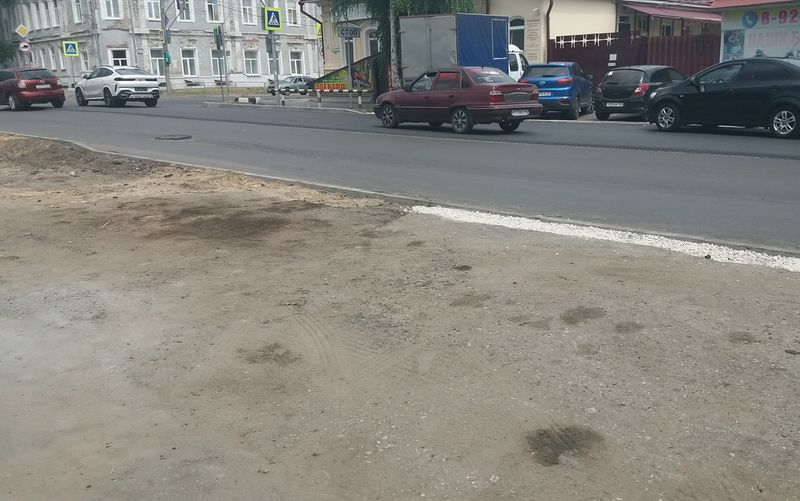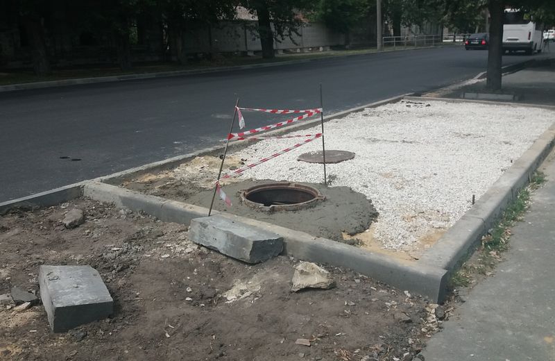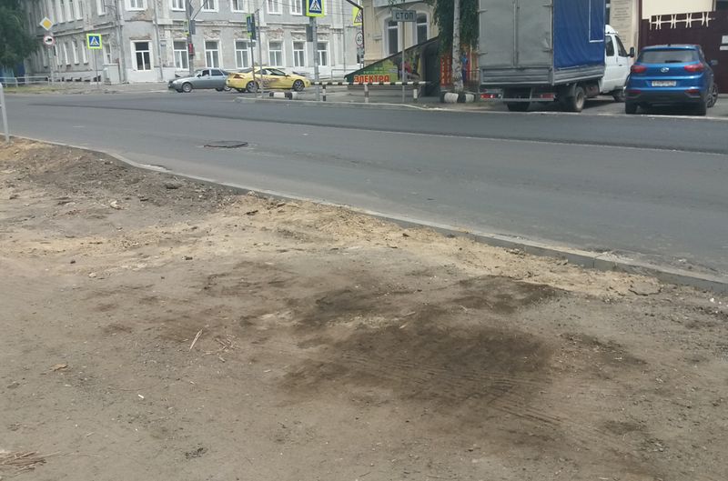 Буквально через несколько дней пришли новые сообщения от горожан – на углу с улицей Урицкого промоину засыпали, а на остановке полностью разобрали всю плитку, засыпали щебенкой, участок вокруг горловины колодца залили бетоном.