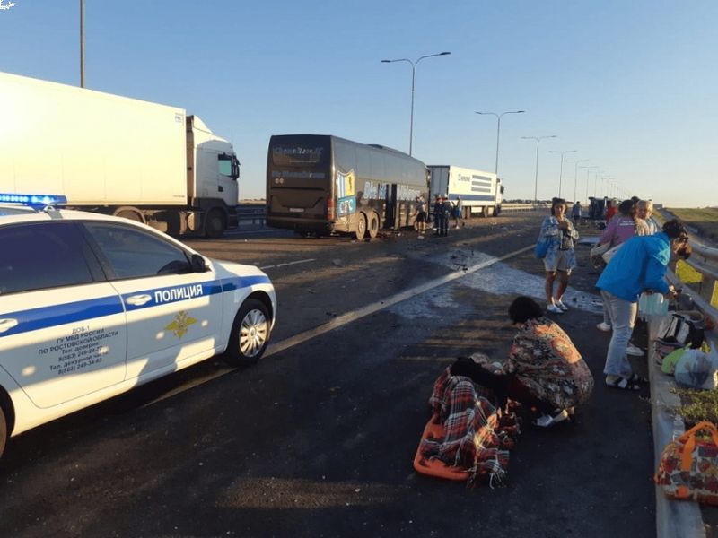 Сегодня на рассвете, около 04:00, в Аксайском районе Ростовской области на трассе М-4 «Дон» туристический автобус Mercedes въехал в фуру Iveco. Как сообщили в ГИБДД региона, автобус с туристами следовал по маршруту «Крым – Тольятти». В автобусе было 44 человека. Они размещены в гостинице на 1024 км трассы М-4 «Дон». ДТП произошло из-за того, что 46-летний водитель автобуса не выдержал безопасную дистанцию и столкнулся с движущейся впереди грузовой машиной. Через некоторое время в социальных сетях появились кадры с места аварии. По ним видно, что от удара у автобуса смяло всю переднюю часть, вылетело лобовое стекло. А грузовик перевернулся на бок. Практически весь перевозимый груз оказался на дороге. В этом ДТП пострадало два человека - второй водитель автобуса и экскурсовод.