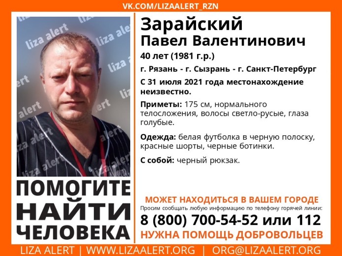 Активисты отряда добровольцев «Лиза Алерт» Рязанской области разыскивают 40-летнего мужчину. К поискам подключились волонтеры. Известно, что Зарайский Павел Валентинович, 1981 года рождения, пропал 31 июля и с тех пор его местонахождение неизвестно. Согласно информации от поисковиков, мужчина может находиться в Сызрани и Санкт-Петербурге. Чем вызваны эти предположения, не объясняется. В момент пропажи мужчина был одет в белую футболку в черную полоску, красные шорты, черные ботинки. При себе у него был черный рюкзак. Рост пропавшего 175 см, нормального телосложения, волосы светло-русые, глаза голубые. Всю информацию, которая может помочь в поисках пропавшего, принимает Лимура Наталья по телефону: 89657113113.