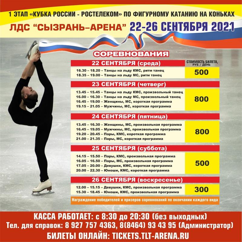 Зрители все же попадут на трибуны «Роснефть-арены»: сызранцы смогут посмотреть выступления прославленных фигуристов и менее известных, но перспективных участников грандиозного ледового состязания. В «Роснефть-арене» Сызрани стартовала продажа билетов на I этап «Кубка России - Ростелеком» по фигурному катанию на коньках и Всероссийские соревнования «Сызранская ласточка». Напомним, ожидается выступление на льду Роснефть-арены в Сызрани «императрицы льда» Елизаветы Туктамышевой, в Сызрани ждут самую красивую пару в фигурном катании – Викторию Синицину и Никиту Кацалапова, Михаила Коляду, Андрея Лазукина и других известных спортсменов. Цена билетов - от 300 рублей. Организаторы крупного спортивного мероприятия опубликовали подробное расписание соревнований.
