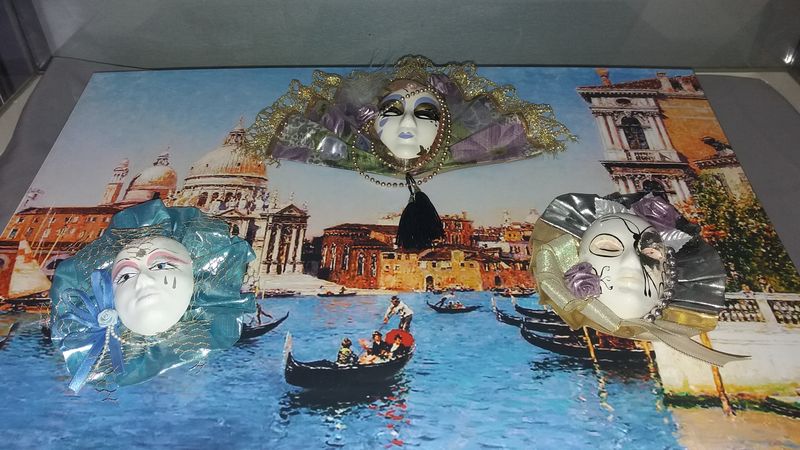 Экспозиция представляет собой 59 инсталляций из картин с видами Венеции с закрепленными на них масками.