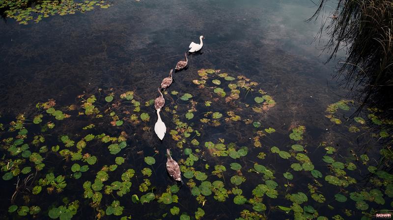 странная «птица» им не угрожает, лебеди успокоились и стали