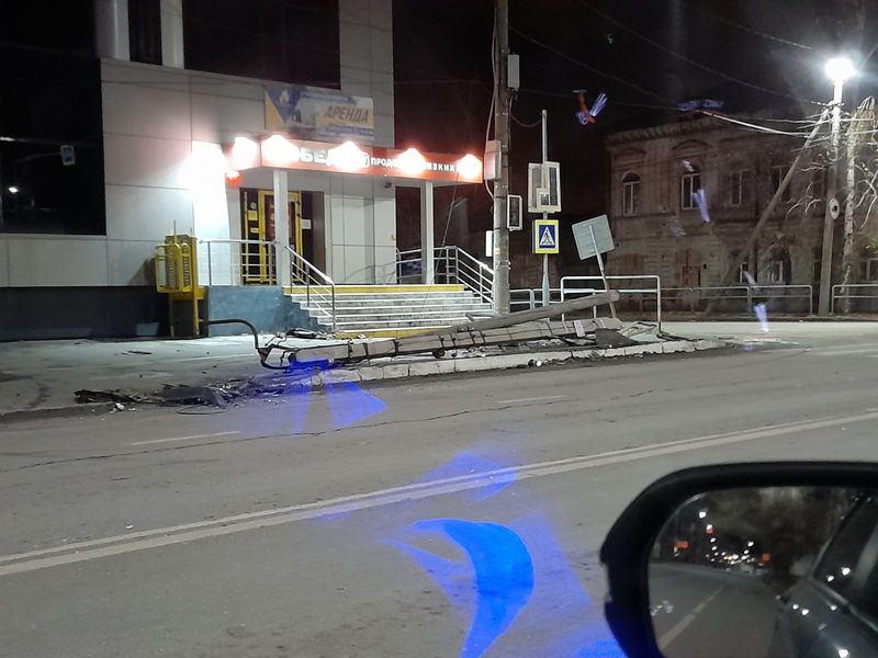 Ночью столкнувшиеся легковушки снесли световую опору на перекрестке, не работает светофор