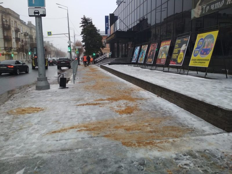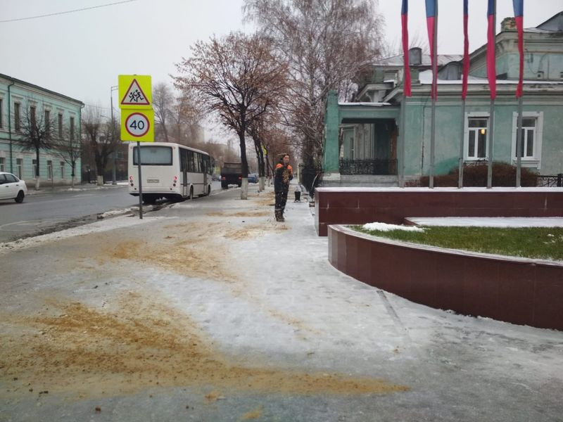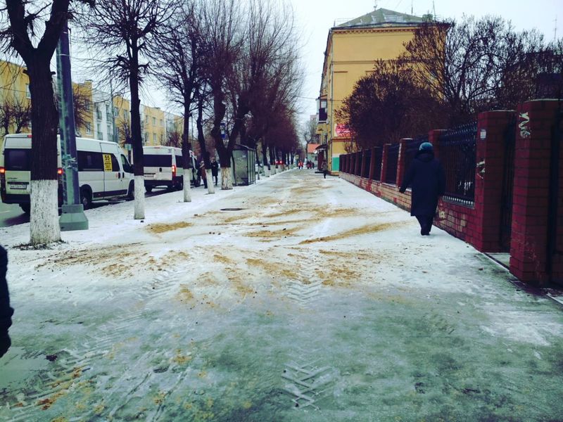 Последние дни в Сызрани ходить по тротуарам было опасно - они напоминали каток, упасть на которых и покалечиться было проще простого. Кое-где пешеходные зоны и тротуары были посыпаны песком, но большая часть, в том числе и в центре города, оставалась опасной для горожан. Во вторник, 30 ноября, в Комитете ЖКХ города сообщили, что ООО «Автодоринжиниринг» для безопасности граждан ежедневно производит посыпку песчано-соляной смесью лестничных спусков и тротуаров в местах образования гололедицы. На представленных фотографиях видно, что песка коммунальщики не жалеют. Однако подобная картина наблюдается не везде - дорог и улиц в городе, где все еще опасно ходить - много.