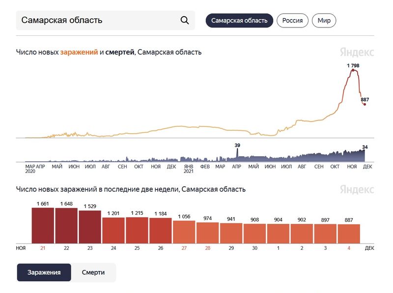 В Самарской области в течение одних суток подтверждено 34 летальных исхода среди тех, у кого ранее была выявлена коронавирусная инфекция. Согласно актуальной на середину дня 4 декабря информации от оперативного штаба по борьбе с распространением заболевания на территории региона, за прошедшие сутки в губернии выявлено 887 новых носителей болезни. В списке числится 29 жителей Сызрани, 12 - Шигонского, 10 - Сызранского районов и 7 жителей Октябрьска. Наибольшее количество заболевших выявлено в Самаре - 389 случаев и Тольятти - 203. С начала пандемии в регионе опасный недуг уже подхватило 183420 человек, скончалось за этот период - 5630 жителей региона.
