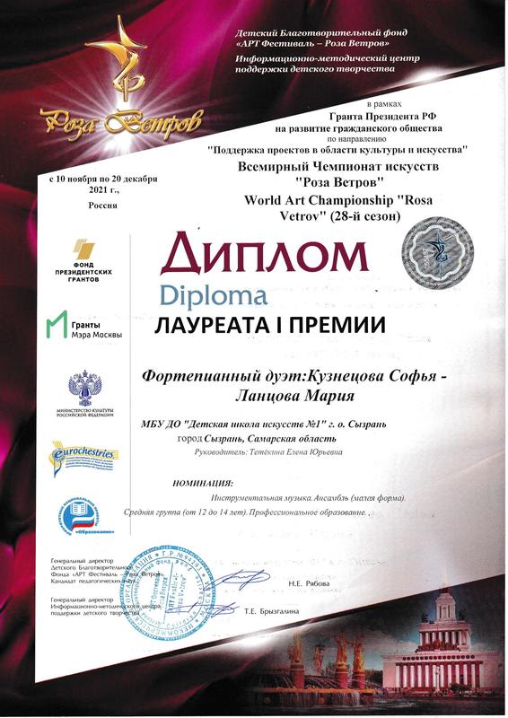 Юные музыкантши, ученицы фортепианного отделения детской школы искусств №1 Сызрани стали лауреатами 1 премии Всемирного чемпионата искусств «Роза ветров». Музыкальная школа на улице Советской, ДШИ №1, стала тем учебным заведением, куда бывшие ученики приводят своих детей и внуков. Когда-то сложно было найти в Сызрани семью, в которой кто-то из родственников не обучался музыке в этой школе, и сейчас она очень популярна среди сызранцев и помогает юным дарованиям совершенствовать свои таланты. Так произошло и с ученицами преподавателя Тетёкиной Е.Ю. 17 декабря Софья Кузнецова, Мария Ланцова, Хабибулина Диляра, Ксения Веретенникова и Тачаева Дарья приняли участие в номинации чемпионата - ансамбль «Малая форма». Жюри конкурса высоко оценило представленные в исполнении дуэта и трио произведения и присвоило звание Лауреатов 1 премии.