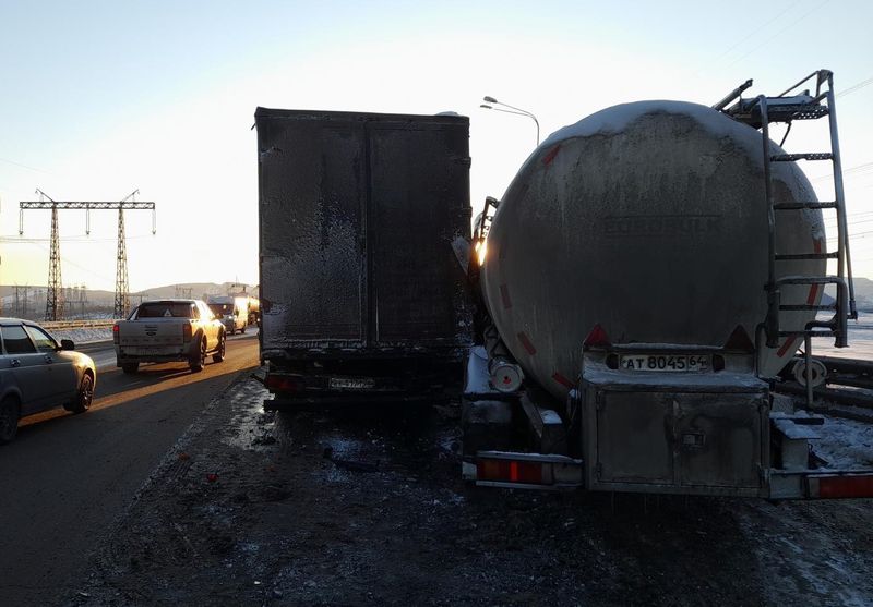Перевозившая удобрение в цистерне Scania врезалась в впереди едущий Камаз - ее водитель госпитализирован