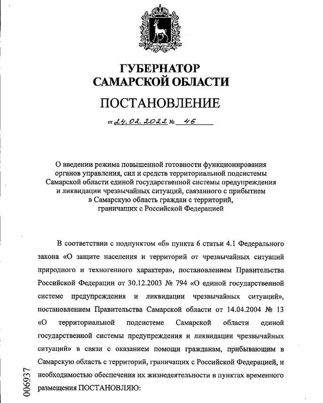 Правительство Самарской области опубликовало постановление о введении режима повышенной готовности функционирования органов управления, сил и средств системы предупреждения и ликвидации чрезвычайных ситуаций. Это связано с прибытием в регион беженцев из Донецкой и Луганской народных республик. Подпись под документом поставил председатель регионального правительства Виктор Кудряшов в качестве и. о. губернатора. В документе сказано о ведении режима с 21 февраля, подписано - 24 февраля, в силу он вступает с момента его опубликования.