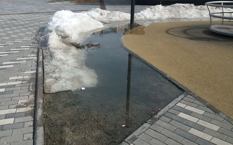 Некоторые игровые площадки в воде, которая не уходит, и скоро, по всей видимости, начнет издавать неприятный запах, так как застаивается. Придется откачивать везде, потому что и погода не помогает - что ни день, то снег. А на завтра синоптики обещают дождь и хмурые бессолнечные дни на ближайшее время.