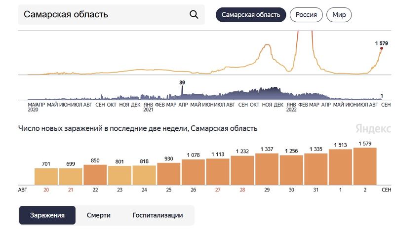 В течение предыдущих суток в Самарской области было выявлено 1579 заболевших COVID-19 в течение 24 часов. Согласно официальной информации по борьбе с распространением коронавирусной инфекции на территории региона, с 25 августа уровень заболеваемости в ковидной кривой приобрел оранжевый цвет, сперва максимально приблизившись к отметке в 1 тысячу инфицированных, а затем и перешагнув ее. Коронавирусная кривая похожа на лестницу с разноразмерными ступенями. По сравнению с показателями на 31 августа, всего два дня назад, прирост составил 244 человека. Нарастающим итогом в регионе зафиксировано 410 808 случаев коронавируса. Скончались за все время пандемии 7962 человека - в том числе один за последние сутки. На 02.09.2022 года было госпитализировано 108 человек. Вчера этот показатель был несколько выше - 117 пациентов.
