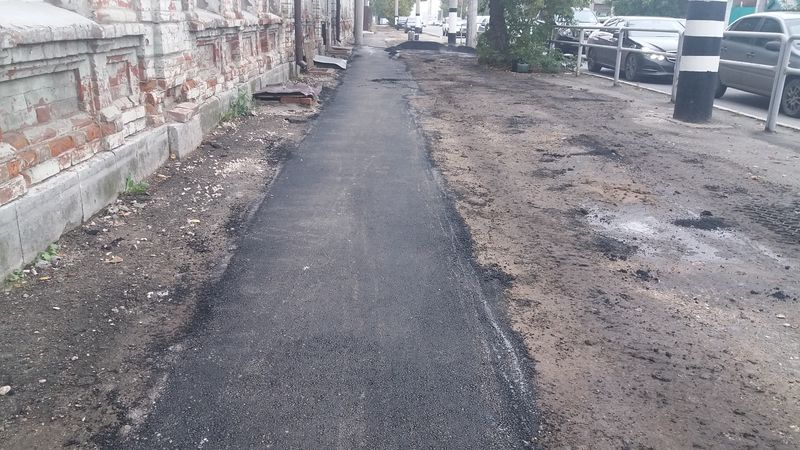 Местные жители ревностно следили за этими работами, так как боялись, что дальше щебенки дело не пойдет. Так что, появлению катка, горы горячего асфальта и бригады рабочих были очень довольны. Вот только качество самих работ не особо порадовало. Впрочем, учитывая, что главной задачей рабочих было не тротуар новый уложить, а заделать вырытые траншеи, то придраться было не к чему. А то, что криво, так в этому случае едва ли есть какие-то критерии, из-за которых работу можно не принять.