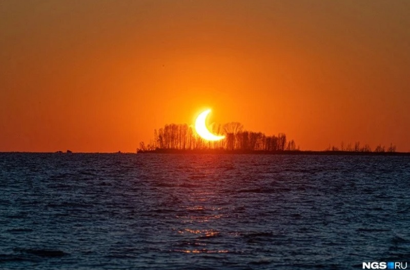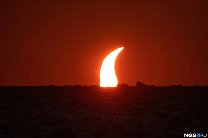 Как красный месяц уходит под воду, можно было наблюдать и на Бердском заливе Новосибирского водохранилища. Такая же картина предстала взору жителей побережья Обского моря.