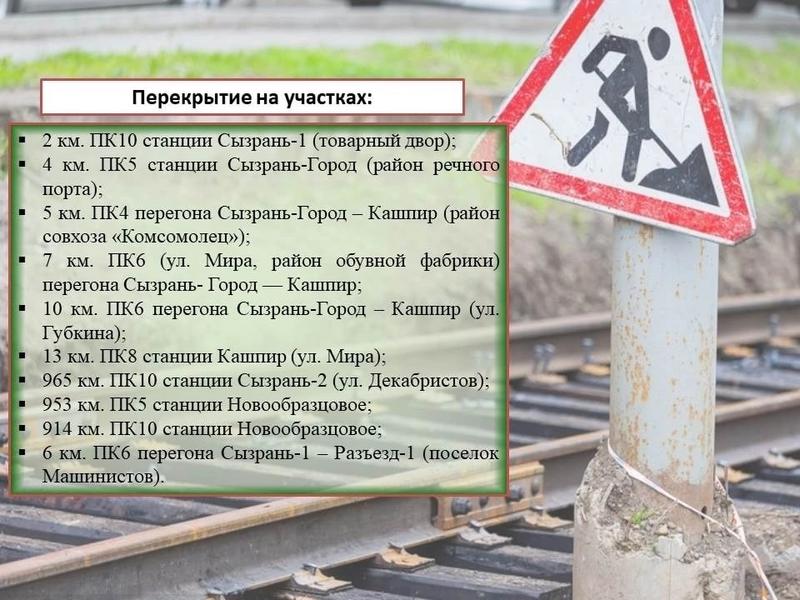 Нервы автомобилистов в Сызрани ждет серьезное испытание: в течение двух недель железнодорожники намерены закрывать переезды в связи с ремонтом путей. Как сообщили в комитете ЖКХ городской администрации, со ссылкой на сызранскую дистанцию путей, что с 1 по 15 ноября запланировано частичное закрытие с ограничением движения автомобильного транспорта через железнодорожные переезды: в списке - участки у товарного двора, речпорта, совхоза «Комсомолец», обувной фабрики, улиц Губкина, Мира и Декабристов, станции Новообразцовое и поселка Машинистов. Кроме того, 2 ноября с 9:00 до 16:00 планируется перекрытие с ограничением движения автомобильного транспорта через железнодорожный переезд 7 км. ПК6 (улица Мира, район обувной фабрики) перегона Сызрань - Город — Кашпир.