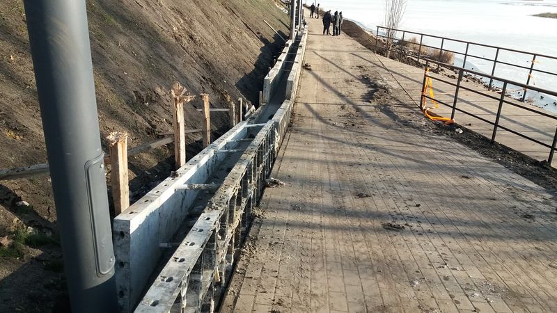 На Монастырской набережной в течение нескольких дней проходит генеральная уборка - тротуарную плитку отмывают в буквальном смысле, асфальтовые дорожки очищают максимально тщательно. Очень затрудняют работу морозы - комья грязи от привезенного грунта для высадки деревьев и после рытья траншеи для возведения подпорной стены счищать не просто, но необходимо. Объект давно пора сдавать, но благоустройство набережной затянулось. Причиной тому можно назвать несколько подрядов, которые были включены в договор по благоустройству позже. Так, подрядчику пришлось обустраивать спуск, который не был предусмотрен проектом, вырубать подросшие кусты на дамбе. Но больше всего задержало работы возведение подпорной стены вдоль пешеходной дорожки внизу склона.