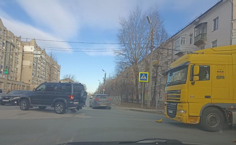 В центре Сызрани столкнулись нефтевоз DAF и УАЗ Патриот, передает с места происшествия корреспондент портала «маленькая Сызрань». Оба автомобиля ехали по улице Фридриха Энгельса в сторону Смирницкой со стороны переулка Волжский, и на перекрестке большегруз догнал Патриот. У большегруза в результате столкновения - поврежден бампер с правой стороны, кусок бампера большегруз потерял. У Патриота поврежден задний бампер с левой стороны. В ДТП никто не пострадал, но автомобили при столкновении затруднили проезд в сторону улицы Московской.