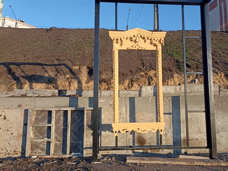 Сразу было предложено несколько вариантов, как можно «спрятать» серую бетонную стену, чтобы она не портила вид уникальных арт-объектов. Но над решением проблемы еще предстоит поработать, чтобы найти лучший вариант. Кстати, не исключено, что наличники могут перенести в другое место.