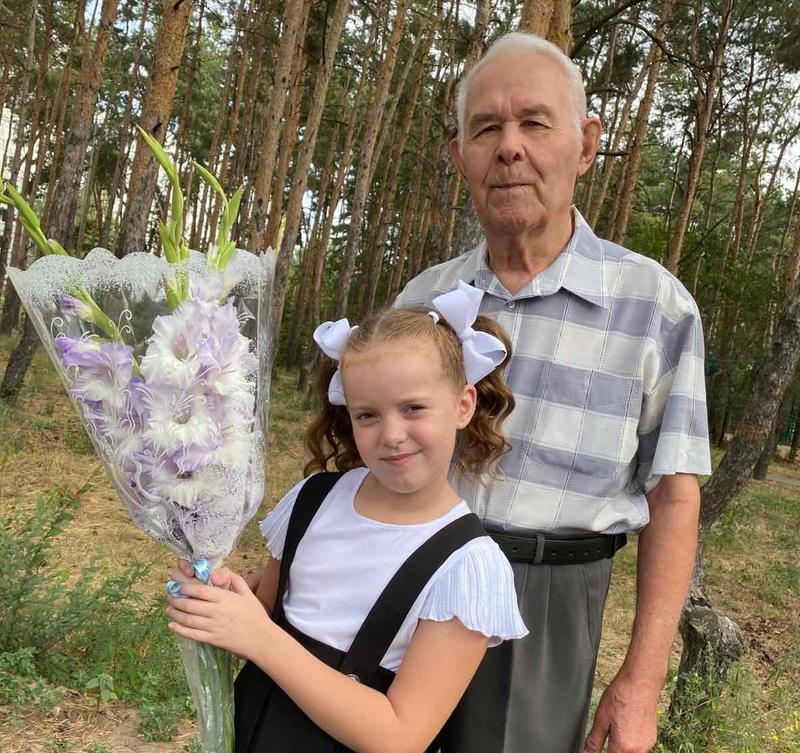 На фото: с правнучкой - в первый класс.
