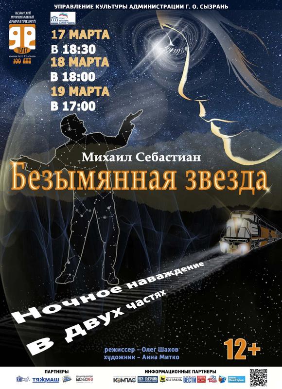 В Сызрани на этой неделе пройдет премьера удивительно романтичного и печального спектакля о несбыточной любви. Сызранский театр готовит премьеру спектакля по пьесе Михаила Себастьяна «Безымянная звезда». Все, кто видел фильм Казакова по этой пьесе, легко вспомнят «летучую» фразу мадам Ку-ку, сторожа нравственности девиц: «Ученицам младших, и особенно старших классов запрещается появляться на вокзале, особенно в часы, когда проходит дизельэлекропоезд!» и печальный вывод одинокого чудака-астронома Мирою: «Звезды никогда не отклоняются от своего пути». Спектакль сызранского театра обещает подарить зрителю особые впечатления. Премьера «Безымянной звезды» 17 марта в 18:30, 18 марта в 18:00, 19 марта в 17:00. Билеты можно приобрести по пушкинской карте.