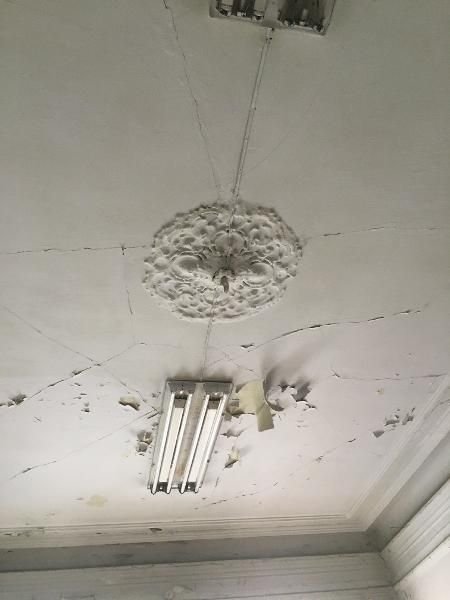 Даже можно сказать, разваливается. Внутренние инженерные коммуникации электроснабжения, теплоснабжения, водоснабжения, водоотведения в здании отсутствуют. Цоколь имеет многочисленные деформации, отмостка частично разрушена, наблюдается выпадение отдельных камней цоколя, проседание фундамента и цоколя. Вследствие осадки фундаментов произошла вертикальная деформация кирпичной кладки стен. Кровельное покрытие повреждено коррозией, частично отсутствует.
