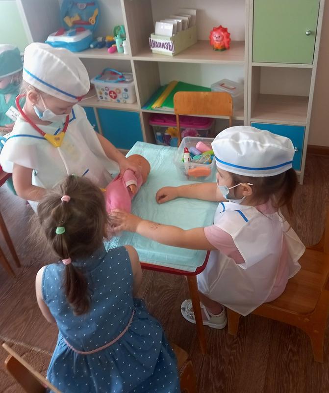 «Мамочка» пришла к «врачу» со своей бедой: она пожаловалась на высокую температуру ребенка. «Ребенка» тоже можно было бы поставить в кавычки: все - и врач, и мама, были участниками сюжетно-ролевой игры в детском саду №3 (ГБОУ СОШ №30). Современные дети, грамотно владеющие гаджетами, «скринейджеры iПоколения», не умеют играть в нормальные детские игры - дочки-матери, доктора и больного, и т.д. Поэтому на помощь им приходят педагоги. Воспитатель О.Н. Наумова провела с детьми две игры: «Приём в детской поликлинике» и «Строительство дома». Девочки играли в поликлинику и очень внимательно слушали своего педагога, которая объясняла им, как общаются в поликлинике врач и пациент.