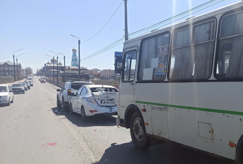 Сегодня, 15 апреля, на Ильинском мосту в Сызрани произошло столкновение трех транспортных средств. Паровозик на мосту собрался в 11:45. По имеющейся информации, 60-летний водитель автобуса ПАЗ, в котором находились восемь пассажиров, двигаясь по улице Интернациональной в сторону Советской, не выбрал безопасную дистанцию до ехавшего впереди в попутном направлении автомобиля Hyundai под управлением 47-летнего водителя, и ударил «корейца» в заднюю часть кузова. А тот в свою очередь по инерции въехал в зад автомобилю Renault под управлением 39-летнего водителя.