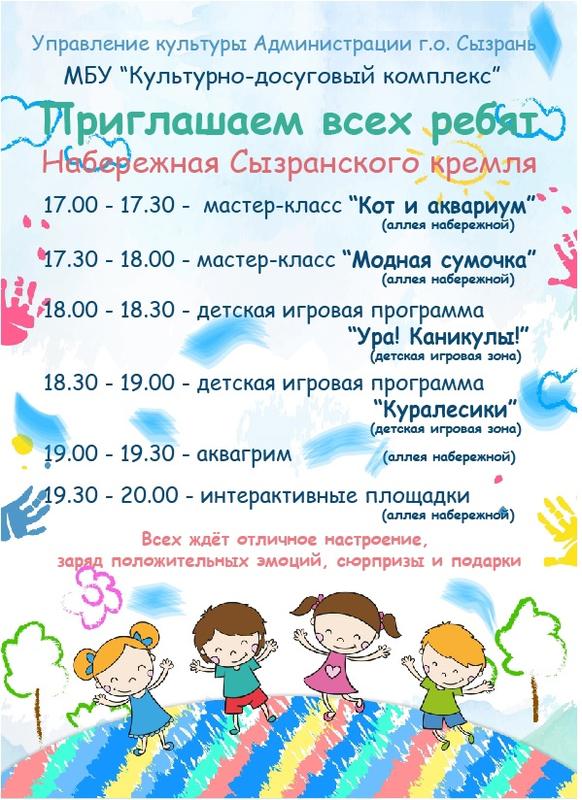 Красочно в Сызрани намерены встретить День защиты детей: в подготовке праздника примут участие и муниципальные организации, и предприниматели, и общественники, и духовенство города. Большая программа запланирована в парке «Гномик»: она стартует в 11 часов спектаклем «Золотой цыпленок»; затем, в 12 часов, в детском парке пройдет шахматный турнир, в то же время на открытой концертной площадке детей будет развлекать Щенячий патруль; с 14 до 16 часов ФК «Актив» проведет в «Гномике» веселую зарядку и мастер-класс по хип-хопу; в 17 часов на сцену выйдут артисты ДК «Художественный»; в 18 часов начнется концертная программа, а в 19 часов - выступят участники городского конкурса «Серебряный дождь». В сызранском театре в этот день пройдут веселые конкурсы с артистами и спектакль «Невеста для царевича».