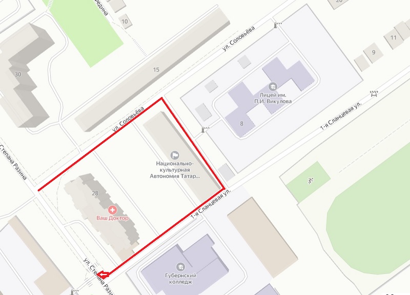 Корпус начальных классов лицея им. П.И. Викулова, куда как раз и трудно попасть его маленьким ученикам, занимает здание бывшего детского сада и находится в довольно уютном месте: большие дороги где-то далеко, здание школы расположилось за домами домами №15 улицы Соловьева и №26 улицы Степана Разина. Но мимо учебного учреждения проходит сквозной проезд вдоль дома №15 по улице Соловьева со стороны улицы Степана Разина в направлении улицы Бабушкина. Хотя этот район ограничен знаками «Жилая зона», «Осторожно дети», «Ограничение скорости 20 км/ч», приоритет пешеходам отдают далеко не все водители.