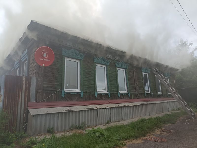 внутри дома. На месте работают пять расчетов противопожарной службы. Для ликвидации последствий пожара перекрыт проезд по улице