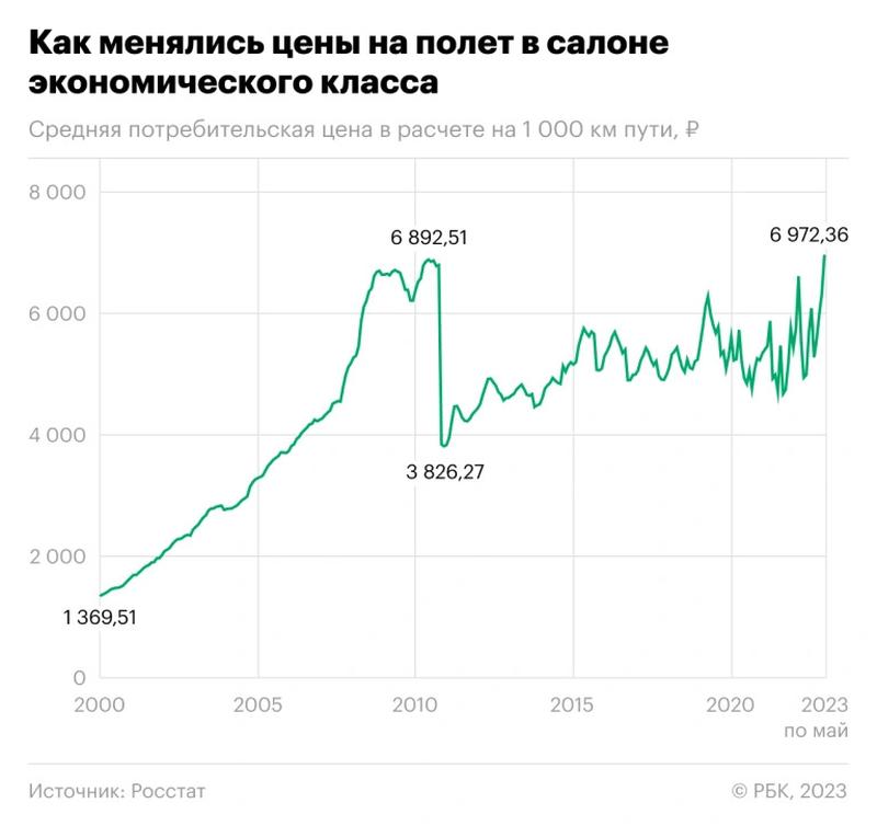 Росстат сообщил о максимальной за 23 года цене перелетов «экономом». В мае цена перелета по России достигла рекордных почти 7000 рублей за тысячу км пути. Это максимальное значение с 2000 года. На цены оказывают влияние дорожающий керосин и сокращение субсидий, считают эксперты. Предыдущий рекорд — 6892,51 рубля - ведомство зафиксировало 13 лет назад, в августе 2010 года. С начала 2023-го за первые пять месяцев цена перелета увеличилась на 32%. При этом, в Минфине сообщили, что в министерство не поступали предложения, направленные на стабилизацию или сокращение стоимости авиабилетов. В ФАС отслеживают стоимость билетов эконом-класса по более чем 500 маршрутам. На стоимость билетов влияют сезонность, спрос и инфляция, а в 2022 году авиакомпании часто проводили распродажу.